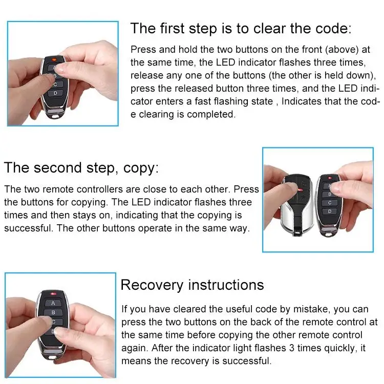 � Application field: suitable for remote control matching and copying of electric door remote control, retractable door remote control, garage door remote control, motor control remote control, curtain control remote control, LED light remote control, automobile and motorcycle remote control, industrial equipment remote control, etc